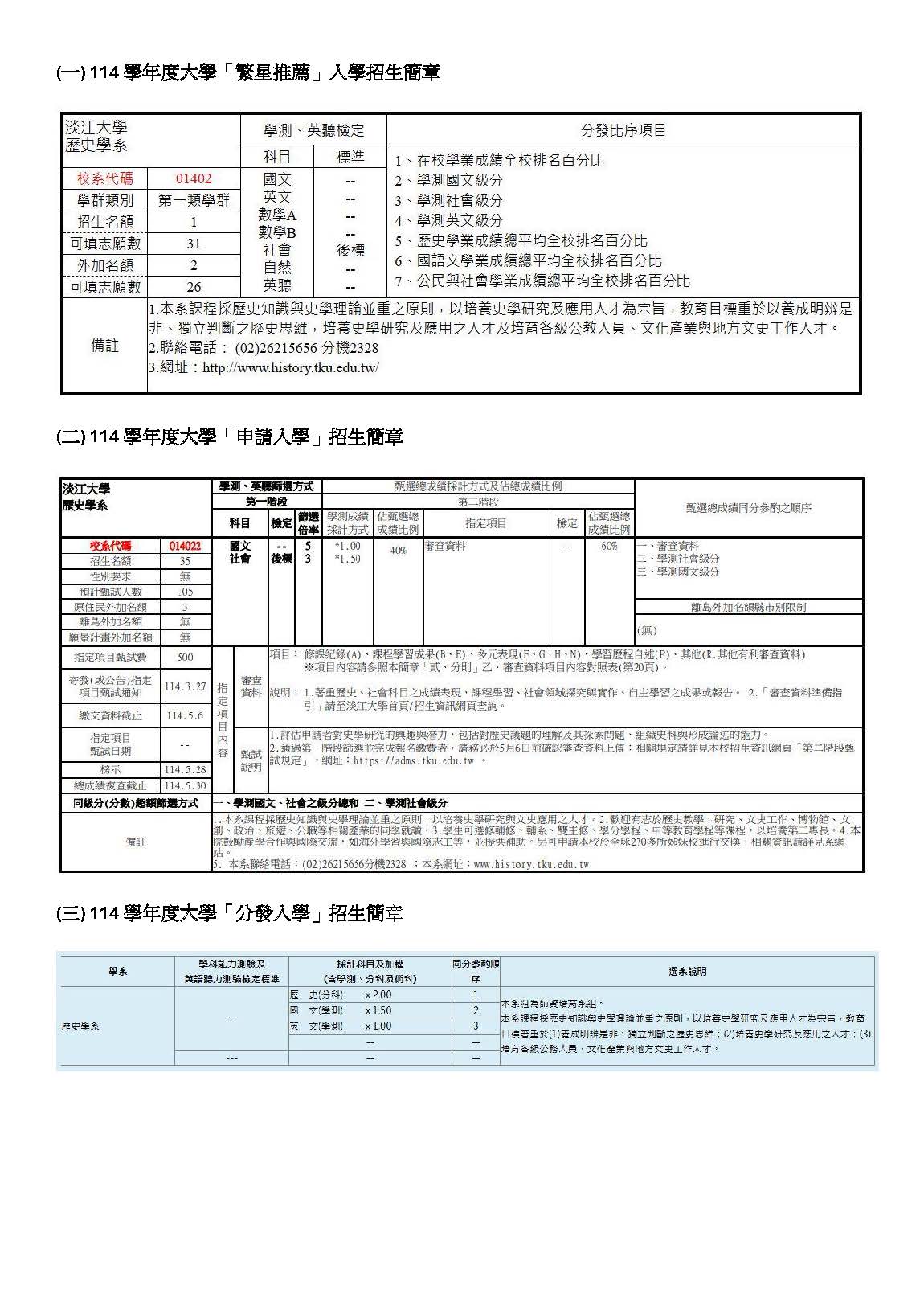 https://www.cac.edu.tw/star114/system/ColQry_114starForStu_4wSdO6dz/html/114_01402.htm?v=1.0 - 114學年度大學歷史學系「申請入學」招生簡章